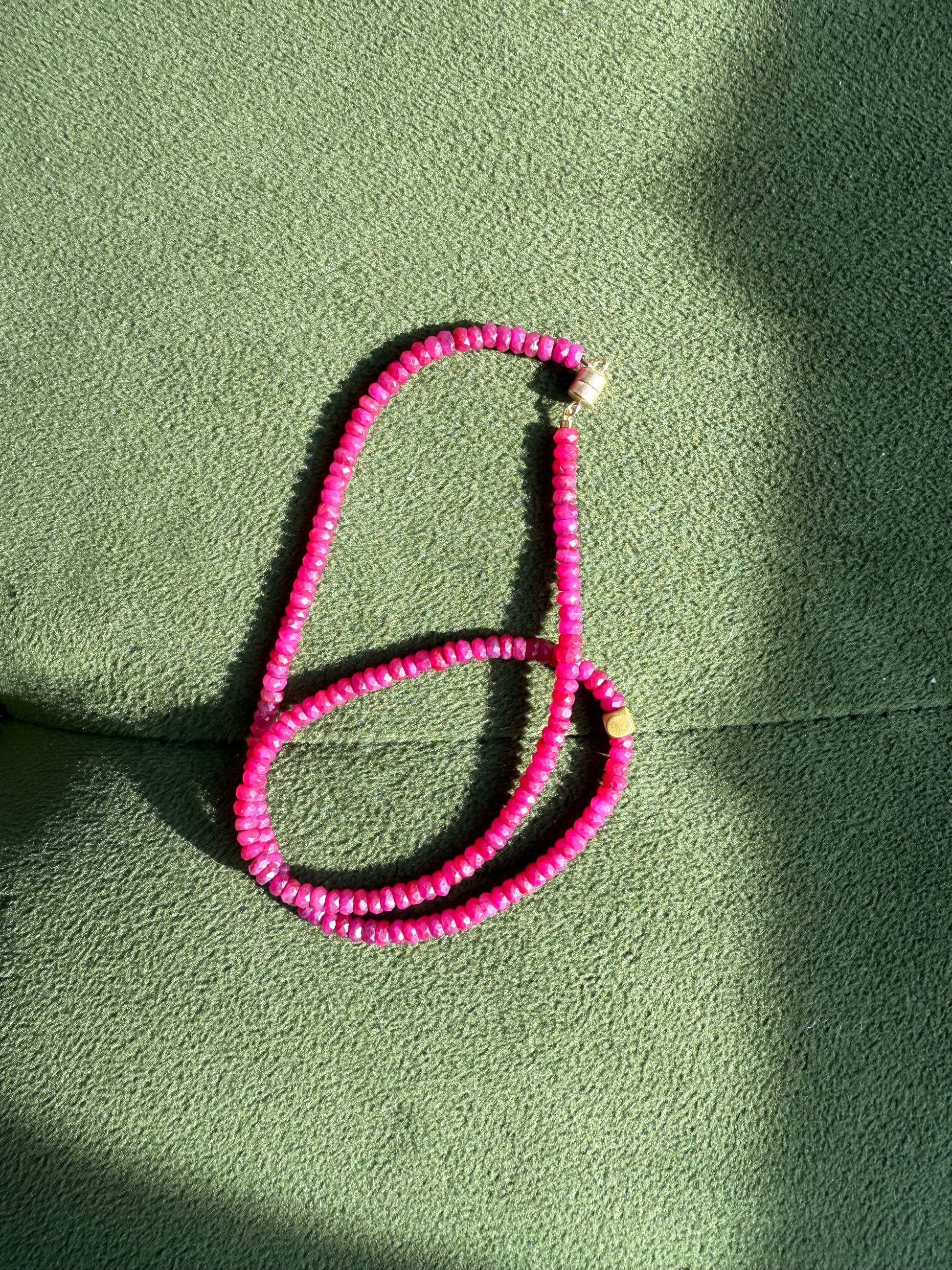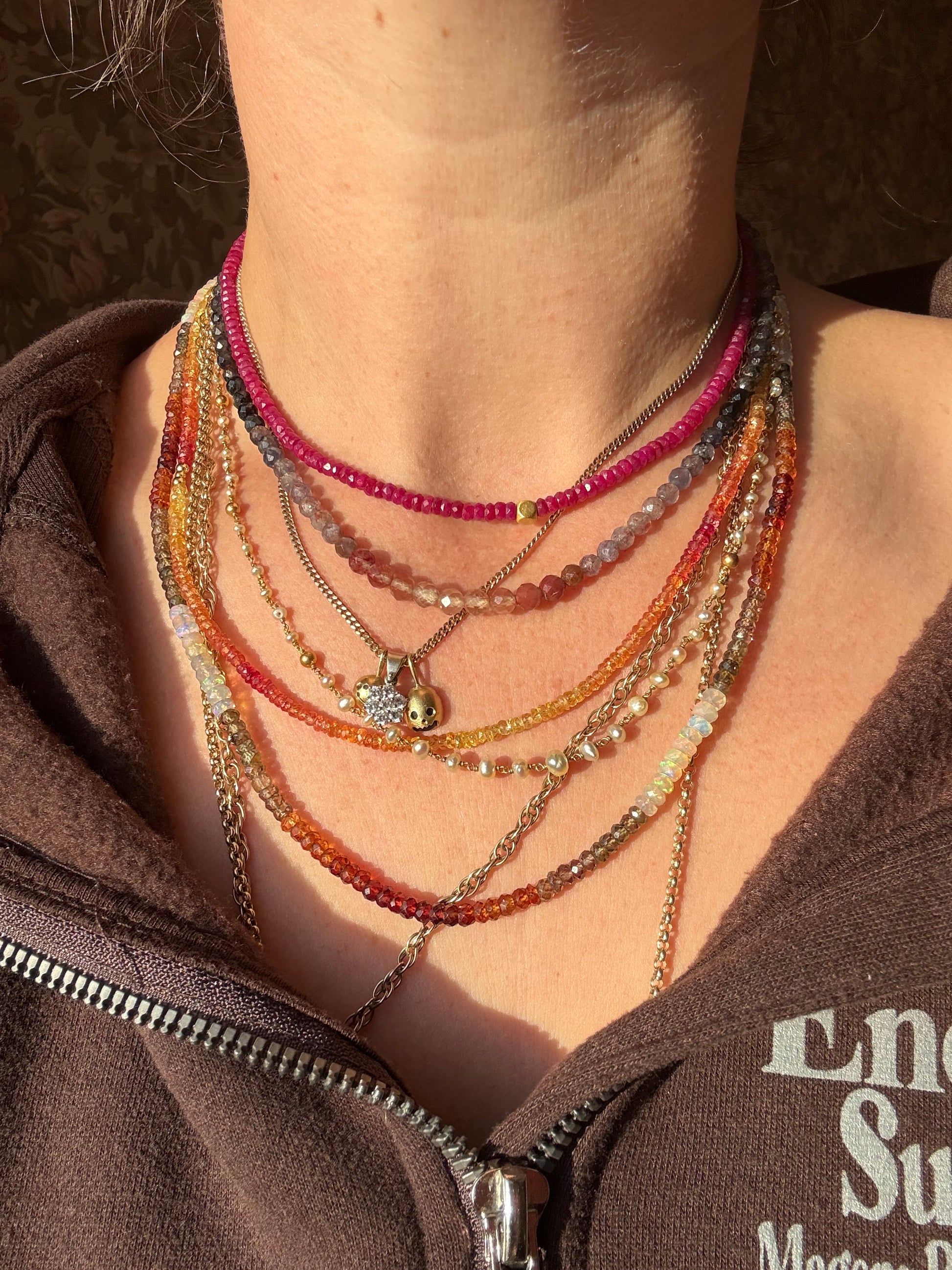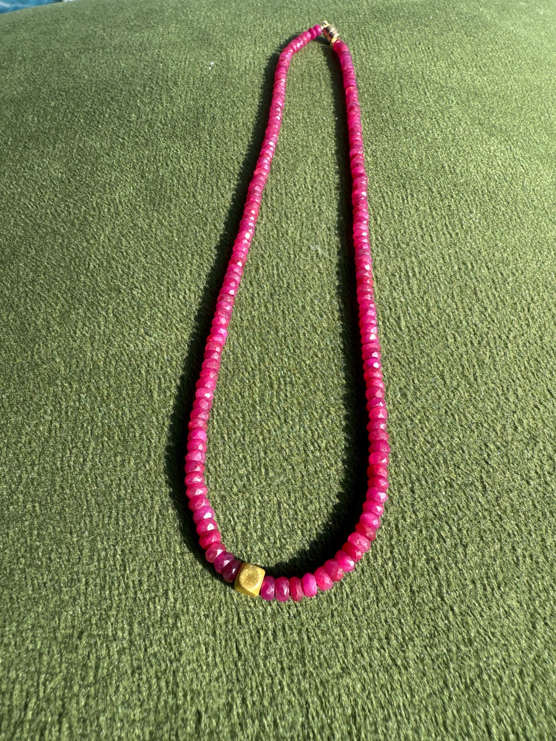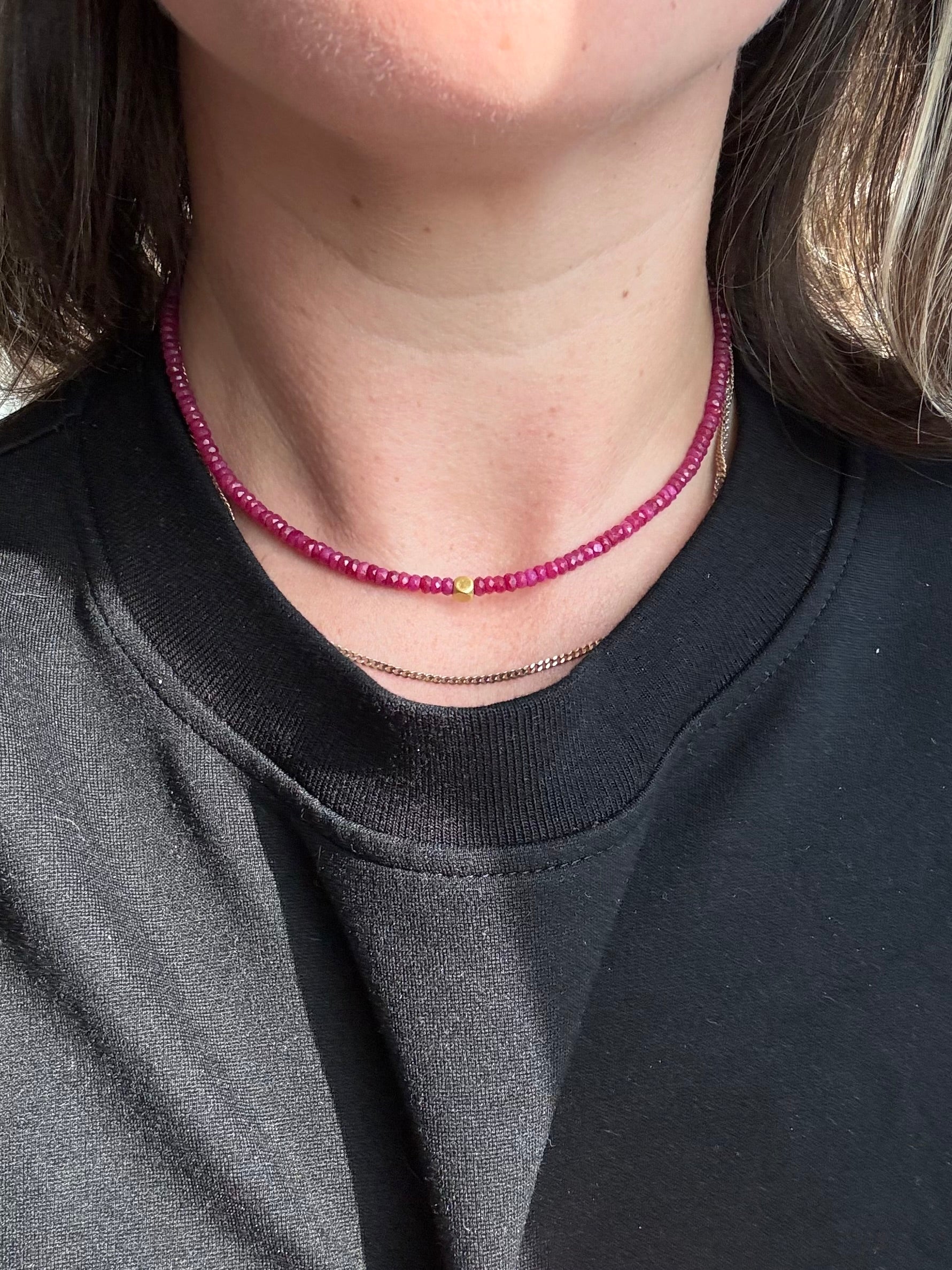 A stunning pop of red, a combination of rubies with an 18k gold bead to sit just at the base of your neck.